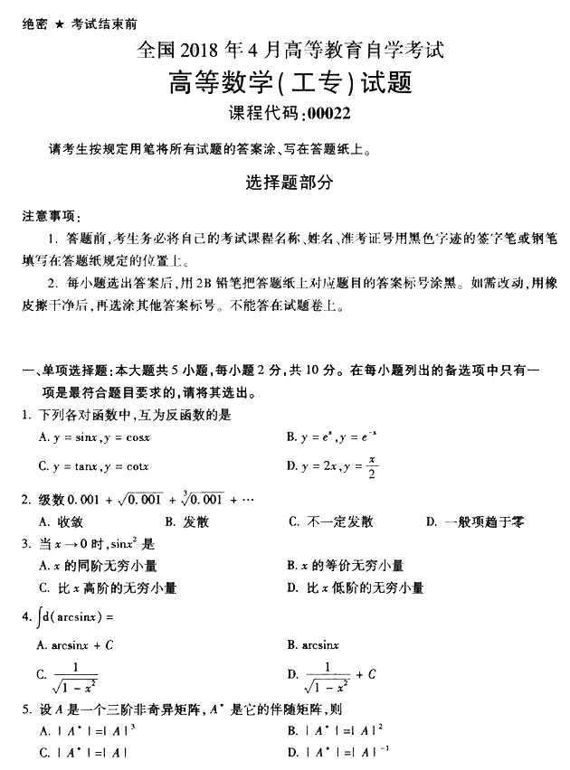 2018年4月全国高等教育自考《高等数学(工专)》试题真题试卷已结束。我们都是普通人,没有钱没有势,只有提高自己,才能改变命运!选择了自考来提升自己,为自己的将来加分。与其老老实实混日子,不如大胆折腾变日子!