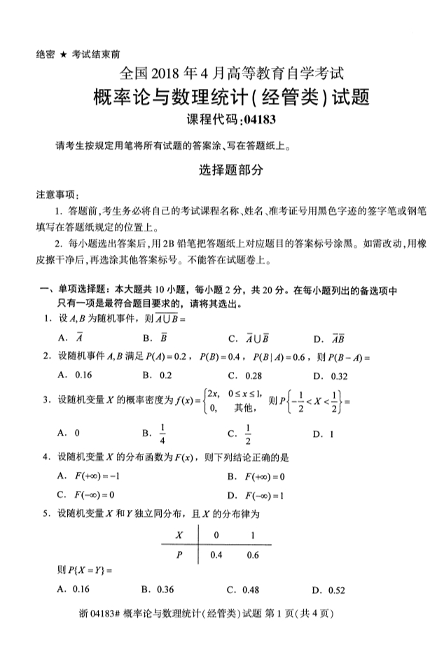 全国2018年4月高等教育自考概率论与数理统计(经管类)试题