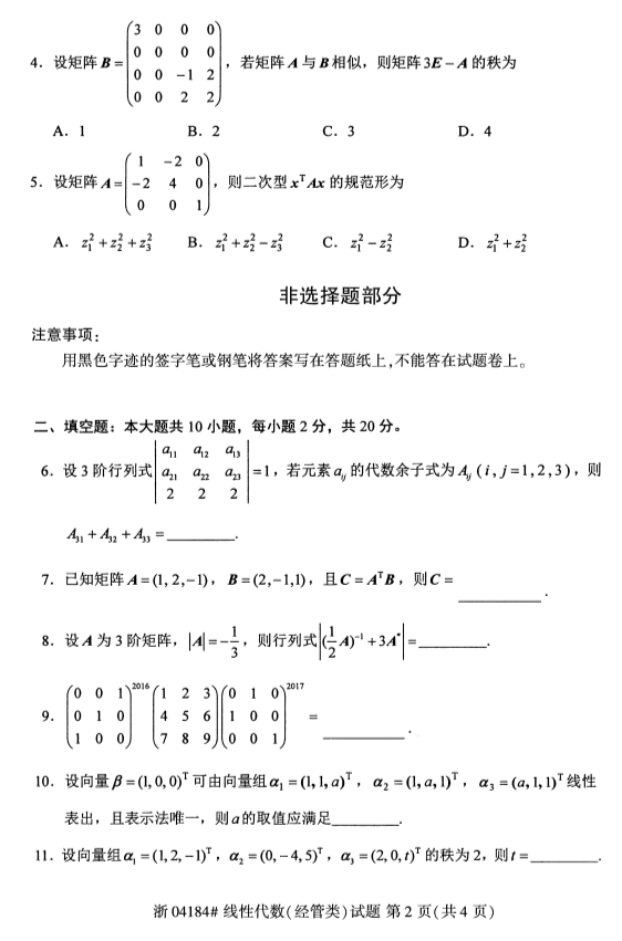 全国2018年4月高等教育自考线性代数(经管类)试题