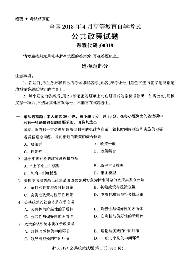 全国2018年4月高等教育自考公共政策试题PDF |