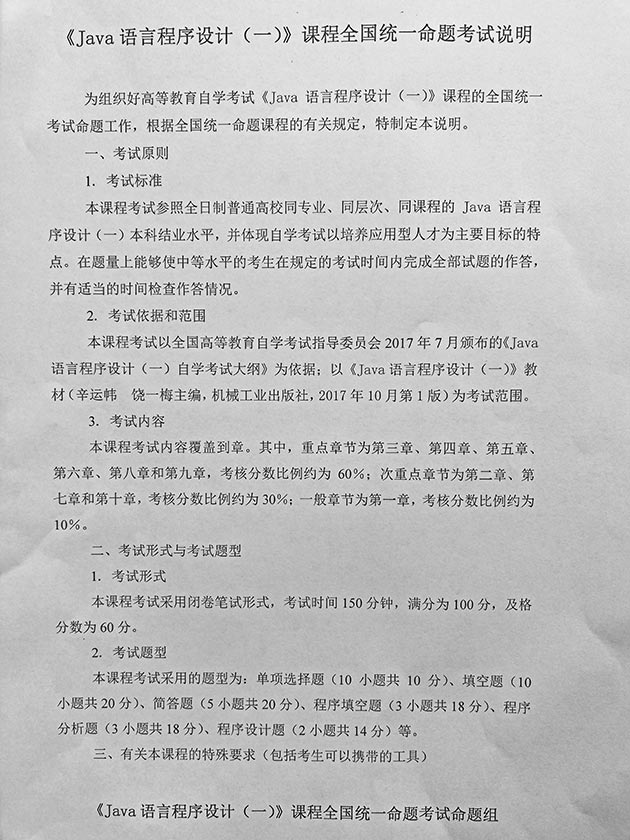 全国统一命题《Java语言程序设计(一)》课程考试说明
