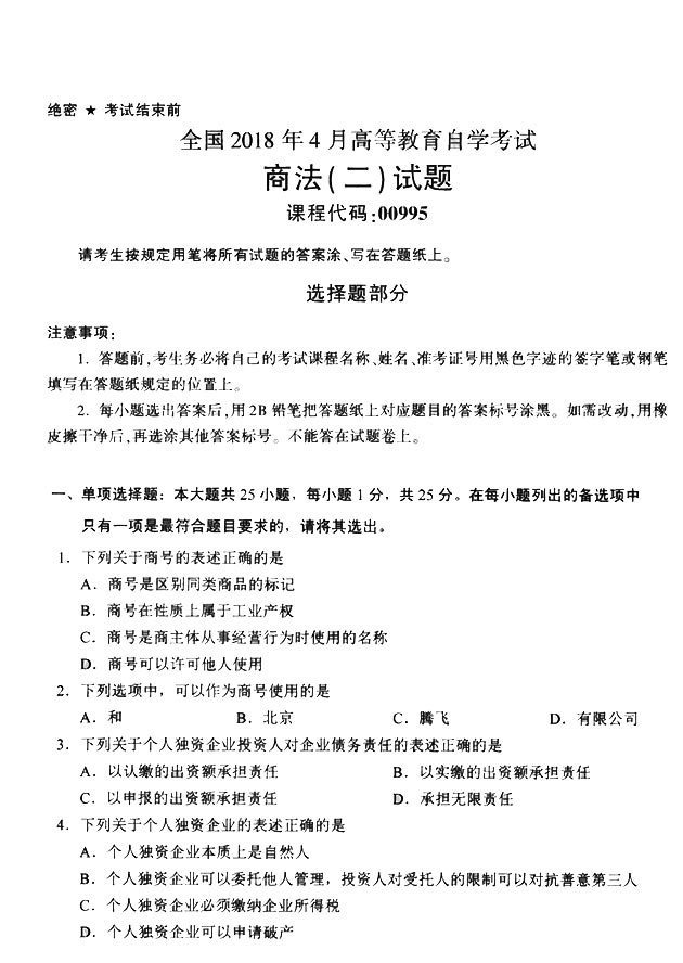 2018年4月全国高等教育自考《商法(二)》真题真题试卷已结束。