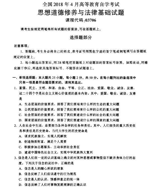 2018年4月全国高等教育自考《思想道德修养与法律基础》试题真题试卷已结束。身处这个社会,拼搏,未必就能成功,但是你不拼,一定不会成功!既然学历是通往成功的敲门砖,那么我们一定要拿下这块敲门砖。