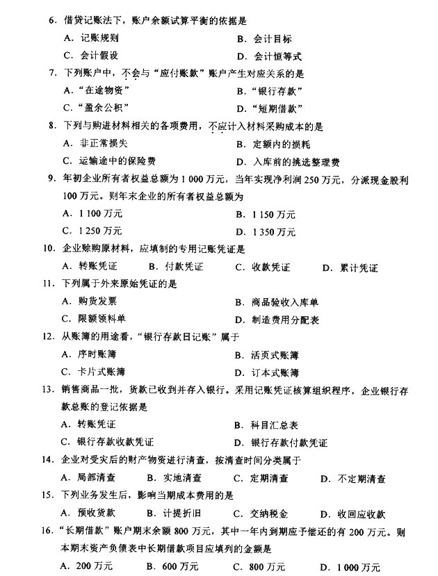 试题练习:2018年4月全国高等教育自考《基础会计学》试题