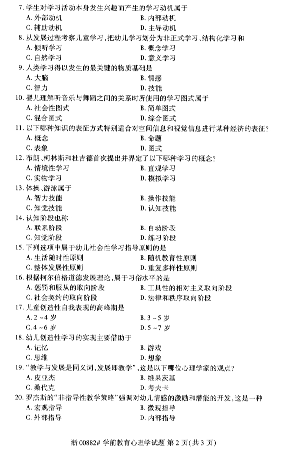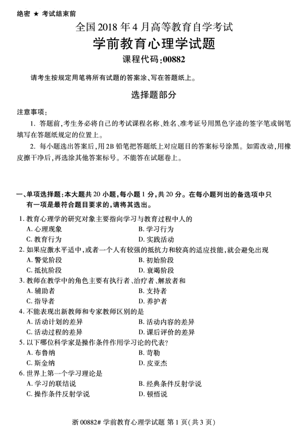 2018年4月全国高等教育自考学前教育心理学试题PDF