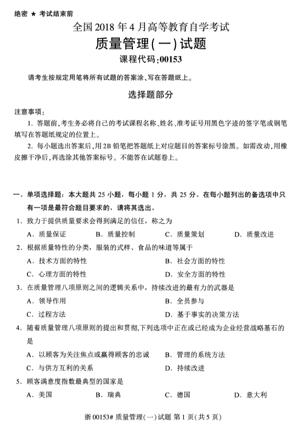 全国2018年4月高等教育自考质量管理(一)试题,由贵州自考网整理。更多自考试题练习,请自考学生关注贵州自考网。