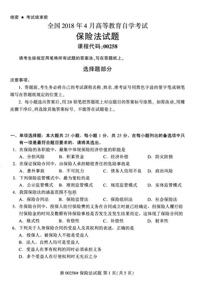2018年4月全国自考保险法试题,由贵州自考网整理。更多自考试题练习,请自考学生关注贵州自考网。